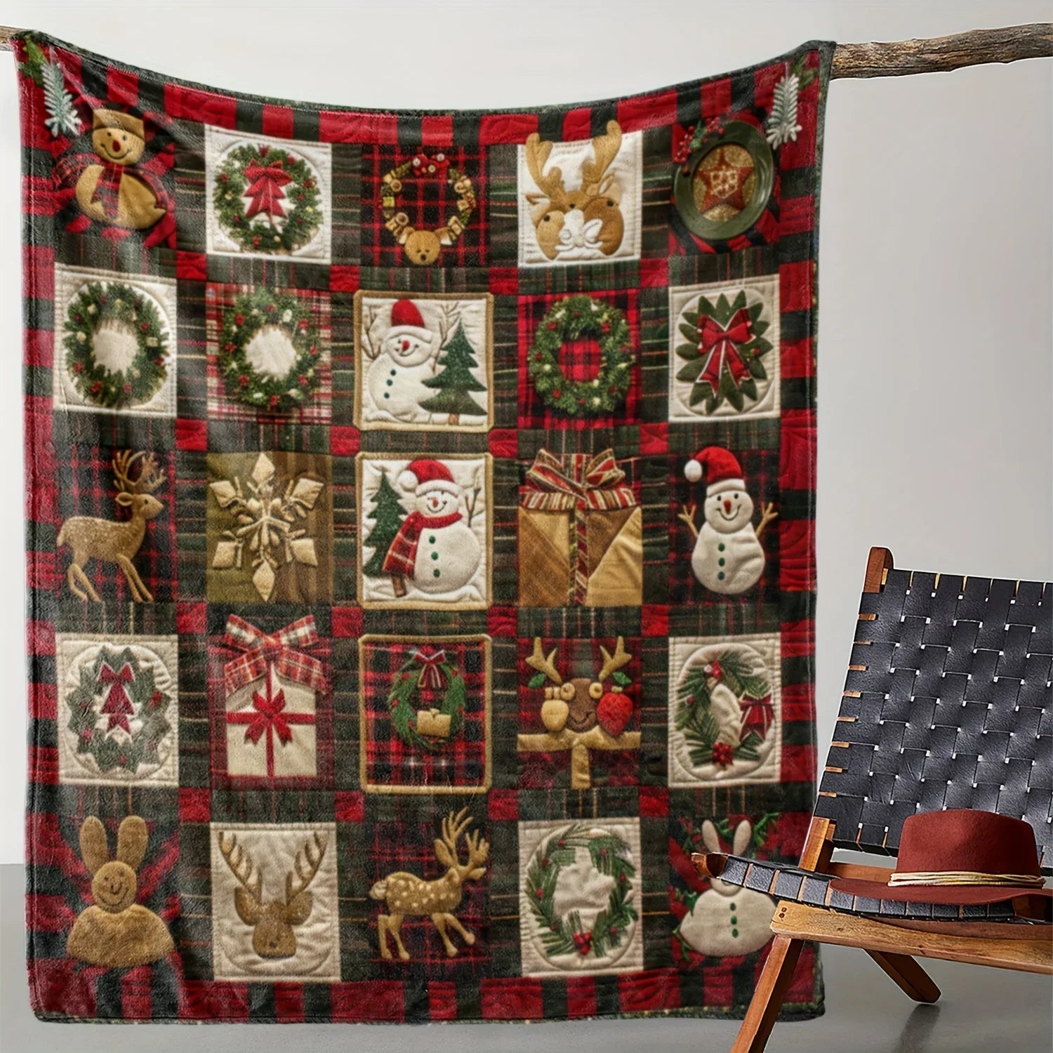 Cozy Festive Christmas Blanket - Vintage-Inspired Wreath, Snowman, Reindeer, and Gift Grid Printed Soft Flannel Throw with Warm